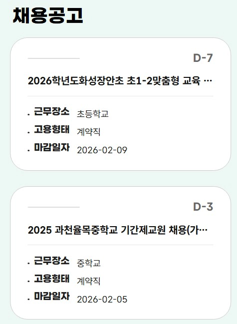 기간제 교사, 교육공무직, 방과 후·늘봄학교 강사, 돌봄 관련 인력, 학교 행정 인력 등 교육 현장에서 실제로 필요한 채용 정보가 중심이 됩니다.