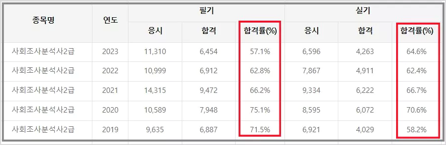 학습의 범위가 넓고 비슷한 용어가 많아 헷갈리는 편이죠. 하지만 합격률은 높습니다. 아래표는 지난 5년간의 사회조사분석사 2급 합격률을 표로 나타낸 것입니다. 사회조사 분석사 2급 합격률은 실기와 필기 모두 60%를 넘어가는 것을 확인할 수 있습니다.
