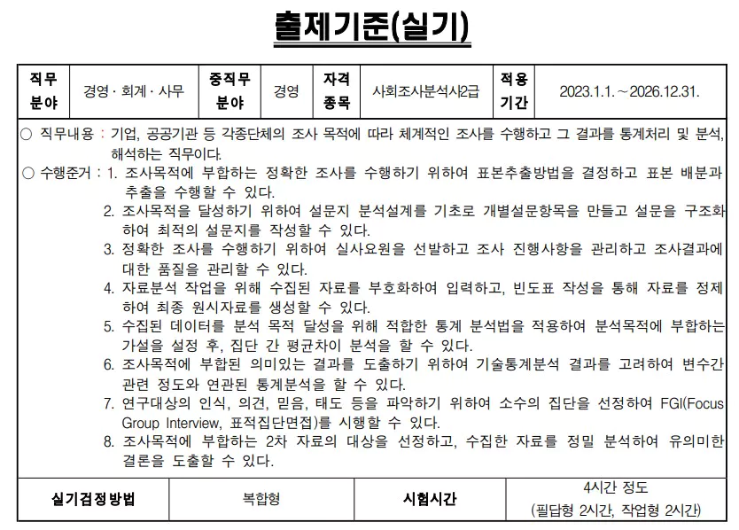 위 화면은 큐넷에서 제공하는 사회조사분석사 2급 출제기준입니다. 2023년부터 2026년까지 적용되는 실기시험의 출제기준입니다.