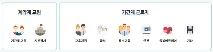 서울교육 일자리포털 홈페이지 첫 화면에는 크게 계약제교원과 기간제 근로자로 카테고리를 분류해 두었습니다. 계약제 교원의 경우 기간제 교원과 시간 강사를 선택할 수 있고, 기간제 근로자 카테고리에서는 교육지원과 급식, 특수교육, 안전, 돌봄 에듀케어, 기타의 항목별로 구분해 두었습니다.