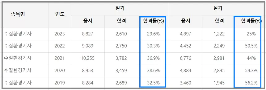 아래는 지난 5년간의 수질환경기사 합격률입니다.