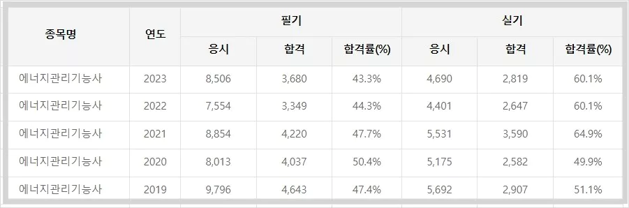 아래표는 지난 5년간 에너지 관리 기능사의 필기와 실기 합격률입니다. 23년에는 필기 합격률이 43.3%, 실기 합격률은 60.1 %였습니다. 대체적으로 필기가 약간 난도가 높지만 일반적인 기능사 시험 정도의 평이한 수준이고 실기 합격률은 살짝 높은 편이네요.