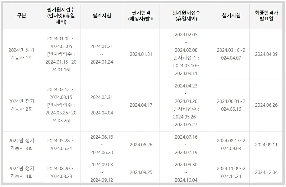 아래표는 2024년 기능사 시험일정표입니다.  모바일 환경에서 화면 클릭하면 크게 볼 수 있습니다.