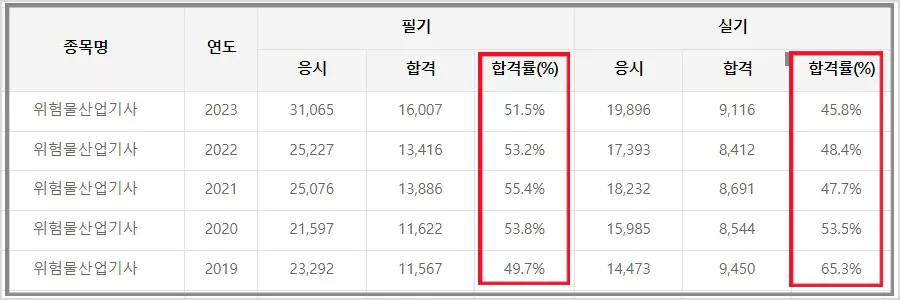 아래 합격률 표에서 보듯이 필기보다는 실기합격률이 좀 더 낮아지는 경향이 보이고 있습니다. 실기시험 준비할 때 그 개념을 세부적으로 정리하는 것이 필요합니다.
