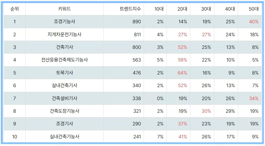 국가기술자격증 건설 트랜드 지수 순위