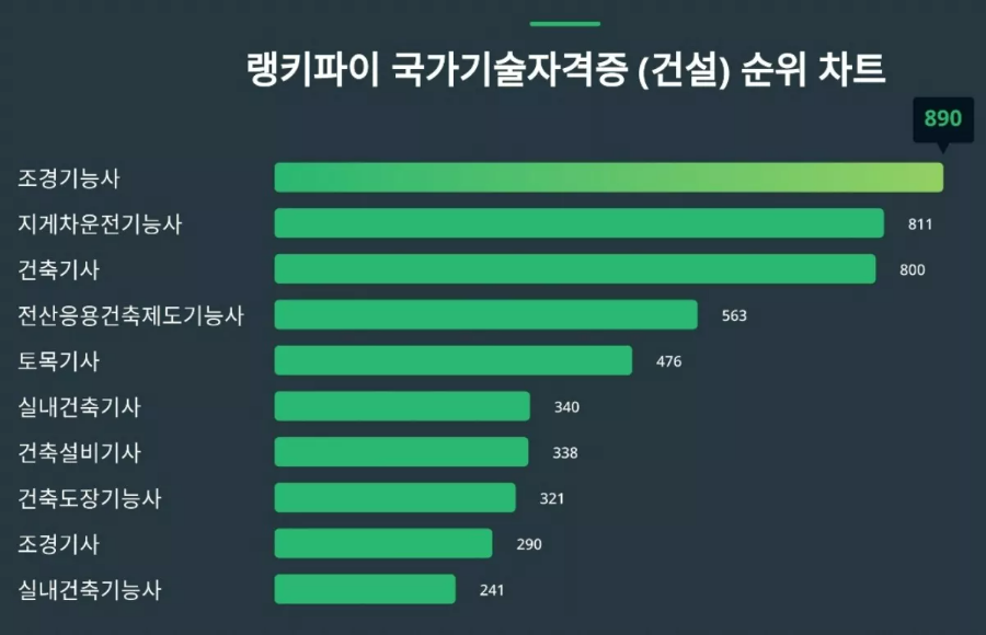 이 외에도 11위 방수기능사, 12위 건축시공기술사, 13위 건축산업기사, 14위 실내건축산업기사, 15위 도시계획기사 등의 순으로 나타났습니다.
