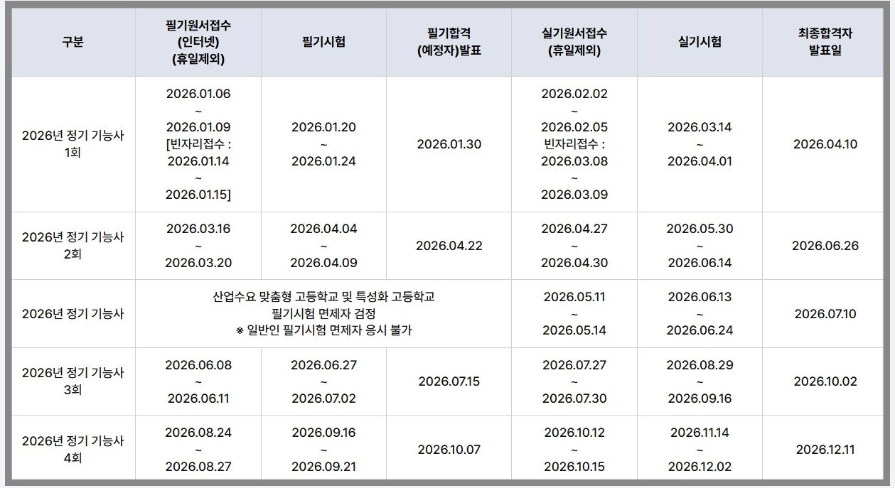 👉 필기 원서접수는 각 회차 첫날 오전 10시부터 마지막날 오후 6시까지이며, 실기 원서접수와 시험도 필기 일정 이후 순차적으로 진행됩니다.