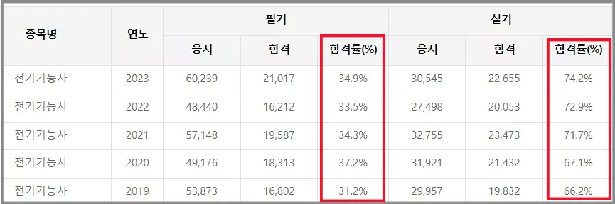 아래는 전기기능사 합격률을 나타낸 자료입니다. 자세히 살펴보시면 필기시험과 실기시험 합격률이 거의 두 배 가까이 차이가 나는 것을 볼 수 있습니다.