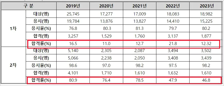 2차 시험 역시 합격률이 2022년부터 40퍼센트로 뚝 떨어진 상황입니다. 난이도가 점점 올라가고 있기 때문에 시험에 도전한다면 준비를 철저히 해야 합니다.