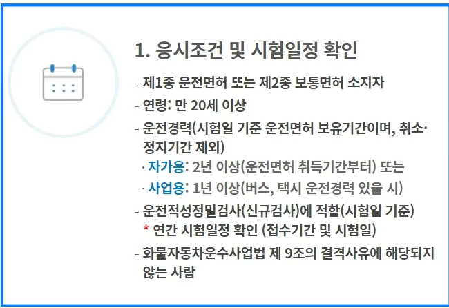 • 운전 경력: 자가용 운전자는 2년 이상 운전경력이 있어야 하고, 버스나 택시 등 사업용 차량 운전 경력자는 1년 이상